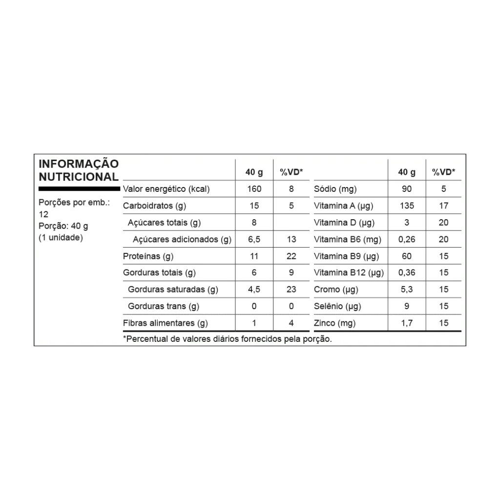 Blend proteico (caseinato de cálcio, proteína concentrada de leite, proteína de soro do leite concentrada, proteina de soro do leite isolada e colágeno hidrolisado), cobertura de chocolate meio amargo, recheio sabor doce de leite e morango HAVANNA, óleo de palma (Elaeis guineenses), morango desidratado, iogurte natural integral pó, polidextrose, frutooligossacarídeos, Fiber 3®[Inulina – fibra da raíz da chicória, goma de acácia purificada e goma guar parcialmente hidrolisada], goma acácia, vitaminas (acetato de retinol, colecalciferol, cloridrato de piridoxina, ácido fólico e cianocobalamina), minerais (sulfato de zinco, selenito de sódio e picolinato de cromo), aromatizantes idênticos aos naturais, cloreto de sódio, edulcorante sorbitol, umectante glicerol, antiumectante fosfato tricálcico, emulsificante lecitina de girassol, conservantes sorbato de potássio e benzoato de sódio, antioxidante dl-alfa-tocoferol, corantes caramelo IV e carmins.